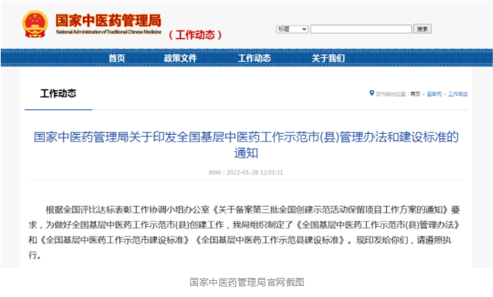 近日,為做好全國基層中醫藥工作示范市(縣)創(chuàng )建工作,國家中醫藥管理局組織制定了《全國基層中醫藥工作示范市(縣)管理辦法》和《全國基層中醫藥工作示范市建設標準》《全國基層中醫藥工作示范縣建設標準》。