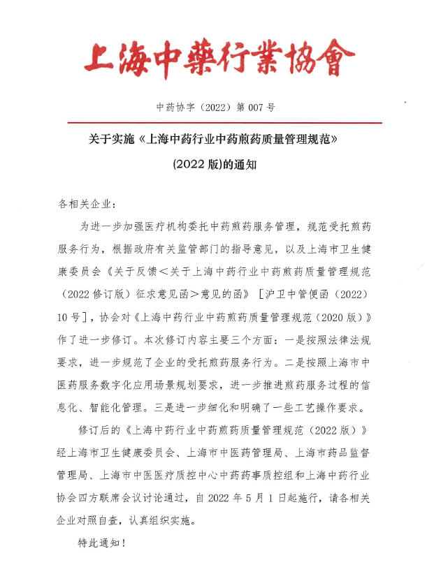 第三十九條?本規范自2022年5月1日起施行,《上海中藥行業(yè)中藥煎藥質(zhì)量管理規范》(2020版)同時(shí)廢止。