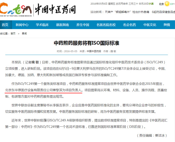 祝賀中藥煎藥機服務(wù)國際標準進(jìn)入研制階段,北京東華原醫療設備有限責任公司姜黎濱總經(jīng)理作為項目負責人將出席6月5日—9日意大利羅馬召開(kāi)的(ISO/TC249)第7次會(huì )議,參與煎藥機國際標準的編制工作。作為ISO/TC249第一個(gè)服務(wù)類(lèi)標準項目,提案將從環(huán)境、材料、設備、人員、操作流程、質(zhì)量控制、包裝等方面對重要煎藥服務(wù)提出規范,中藥服務(wù)國際標準的研制,將為中藥服務(wù)發(fā)展提供標準支持。這意味著(zhù)中藥煎藥機服務(wù)走向世界的步伐更加有力了。