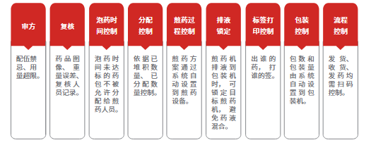 全流程掃碼管理,可對藥品批次、產(chǎn)地等信息、藥品質(zhì)量報告、煎煮全流程信息、各環(huán)節操作人員及設備溯源,建立了嚴格的全流程追溯體系。