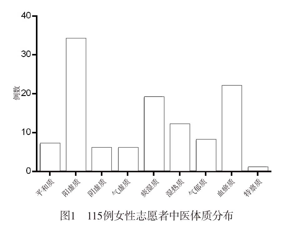 1. 體質(zhì)分布基本特征 見(jiàn)圖1。115例女性志愿者,其中平和質(zhì)7例(6.1%),陽(yáng)虛質(zhì)34例(29.6%),陰虛質(zhì)6例(5.2%),氣虛質(zhì)6例(5.2%),痰濕質(zhì)19例(16.5%),濕熱質(zhì)12例(10.4%),氣郁質(zhì)8例(7.0%),血瘀質(zhì)22例(19.1%),特稟質(zhì)1例(0.9%)。其體質(zhì)類(lèi)型分布最多的前3位分別是陽(yáng)虛質(zhì)、血瘀質(zhì)和痰濕質(zhì)。