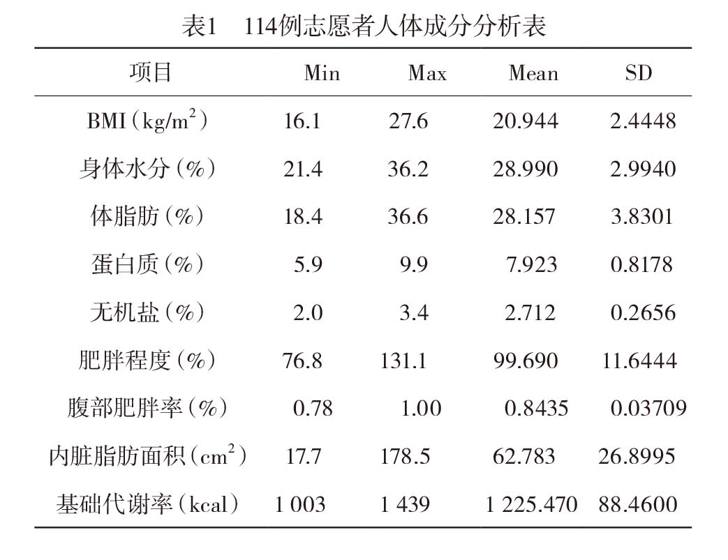 2. 人體成分基本特征 見(jiàn)表1。人體成分分析儀共記錄了114例女性志愿者的BMI、體脂肪、身體水分、蛋白質(zhì),無(wú)機鹽,肥胖度、腹部肥胖率、內臟脂肪面積、基礎代謝率9個(gè)指標。