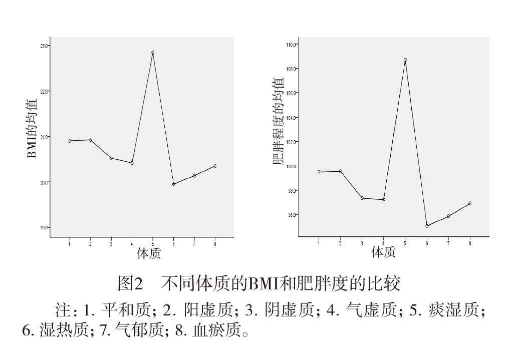 3.2.2 肥胖程度:見(jiàn)圖2。將8種不同體質(zhì)組的肥胖程度進(jìn)行比較,通過(guò)方差分析F=2.482,肥胖度的不同體質(zhì)的分布有統計學(xué)差異(P<0.05),且痰濕質(zhì)的肥胖程度與其他體質(zhì)相比最高。