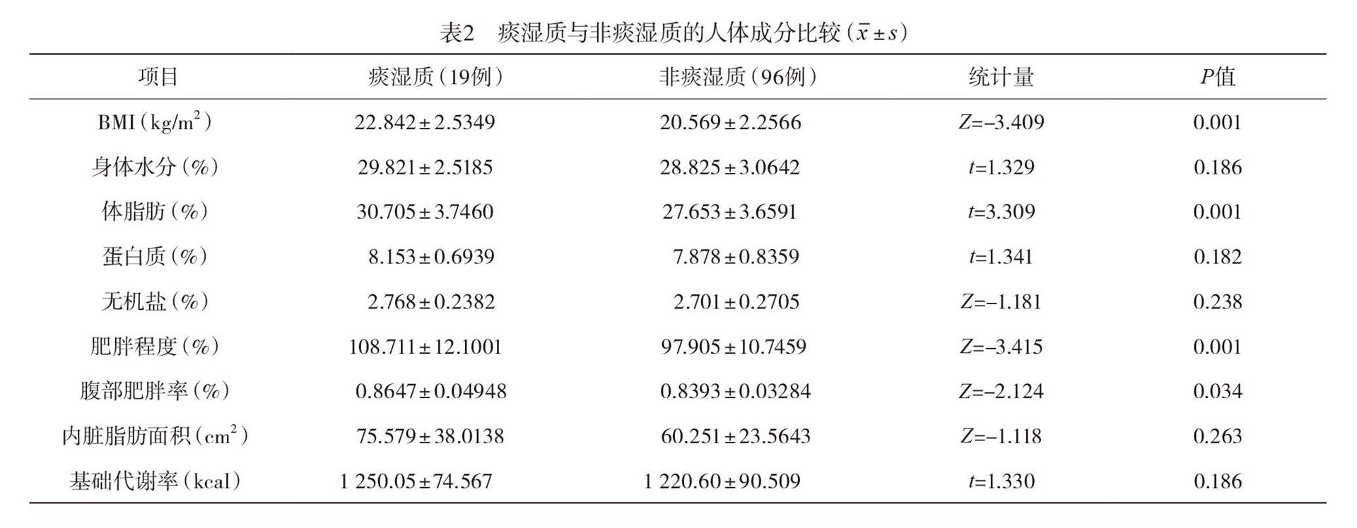 本試驗共有165例受試者簽署知情同意書(shū)進(jìn)入試驗,有3例因人體成分測試操作不當,數據有誤被剔除;1例因體質(zhì)調查問(wèn)卷條目有遺漏,無(wú)法判定體質(zhì)類(lèi)型,故予以剔除。最終納入試驗的有效樣本量為161例,其中男性46例,女性115例。由于本研究旨在研究體質(zhì)類(lèi)型與人體成分的相關(guān)性,而所收集志愿者的男女比例相差較大,且人體成分男女差異顯著(zhù),為避免誤差,使基線(xiàn)可比,本研究只以女性志愿者為例,分析體質(zhì)與人體成分的相關(guān)性。