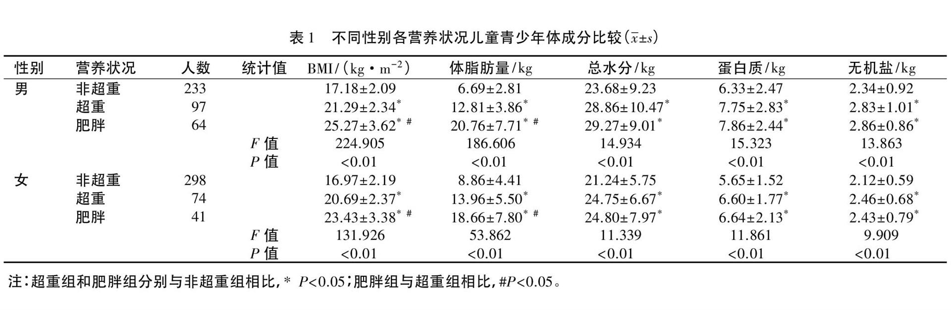 2.1 不同營(yíng)養狀況兒童青少年體成分比較 807 名中小學(xué)生中,非超重組531 名,占65.8%,其中男生233名,女生 298 名;超重組 171 名,占 21.2%,其中男生 97名,女生 74 名;肥胖組 105 名,占 13.0%,其中男生 64名,女生 41 名。經(jīng)正態(tài)分布檢驗,男、女生不同營(yíng)養狀況的體成分均符合正態(tài)分布。由表1 可見(jiàn),男、女生不同營(yíng)養狀況組間體成分差異均有統計學(xué)意義(P 值均<0.01)。兒童青少年的 BMI、體脂肪量、總水分、蛋白質(zhì)、無(wú)機鹽均值均為肥胖組、超重組>非超重組,不論男女,差異均有統計學(xué)意義(t 男 值分別為 - 17. 102,- 14. 341,-4.307,-4.385,-4.088,-14.969,-14.129,-4.235,-4.290,-4.094;t 女 值分別為 11.901,7.876,2.765,2.852,2.470,12.846,7.406,4.552,4.649,4.315,P 值均<0.05);肥胖組和超重組相比,除女生的無(wú)機鹽含量均值超重組>肥胖組,其他均為肥胖組>超重組,但是僅 BMI 和體脂肪量差異均有統計學(xué)意義(t 男 值分別為 -7.780,-7.646;t 女 值分別為 -5.096,-3.771,P 值均<0.05)。