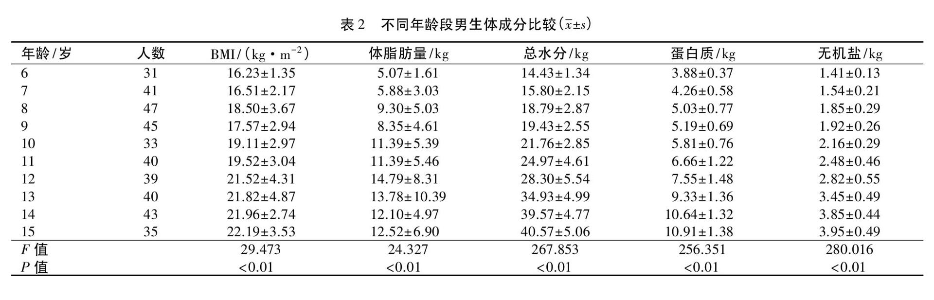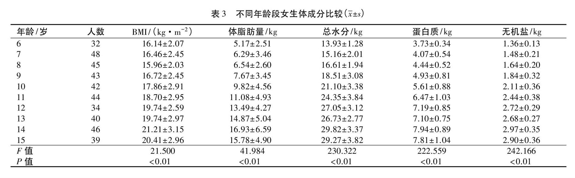 由表 2~3 可見(jiàn),男、女生的 BMI 逐年增長(cháng),差異均有統計學(xué)意義(P 值均<0.01);男生每個(gè)年齡段的 BMI都高于女生,僅 8,12,13,15 歲的差異均有統計學(xué)意義(t 值分別為 4.141,2.167,3.261,2.348,P 值均<0.05)。男生 6~12 歲階段的體脂肪量逐年增加,13 歲開(kāi)始逐年減少,女生的體脂肪量逐年增加,差異均有統計學(xué)意義(P 值均<0.01);12 歲之前男生體脂肪量均值大于女生,13 歲以后體脂肪量均值小于女生,其中8,14,15 歲的差異均有統計學(xué)意義(t 值分別 3.321,-3.882,-2.359,P 值均<0.05)。男、女生的總水分、蛋白質(zhì)、無(wú)機鹽均值逐年增加,差異均有統計學(xué)意義(P 值均<0.01);男生每個(gè)年齡段以上 3 種體成分的均值都大于女生,其中 8,13,14,15 歲的差異均有統計學(xué)意義(t 值分別為 4.232,10.064,11.202,10.738,P 值均<0.05)。
