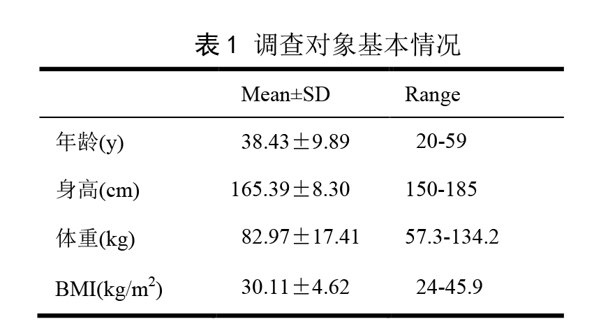 1.1 對象 2013 年 11 月 9 日至 2014 年 1 月 25 日間,在知情同意的基礎上,招募 BMI≥24,年齡 20~60 歲的成年人共 148 人,其中男性 61 人,女性 87 人,如表 1 所示,平均年齡為38.43±9.89 歲,平均身高為 165.39±8.30cm,平均體重為 82.97±17.41kg,平均 BMI 為 30.11±4.62,按中國成人超重和肥胖癥預防控制指南中 [6] 的肥胖、超重范圍進(jìn)行分組,24≤BMI<28 為超重,BMI≥28 為肥胖。經(jīng)詢(xún)問(wèn)病史,排除各種重要臟器病史(如心血管疾病、肺炎、肝炎、胃炎、腎炎等)、身體發(fā)育缺陷、代謝性疾病等,所有受試者分別同時(shí)采用 BIA和 DXA 測定人體成分。