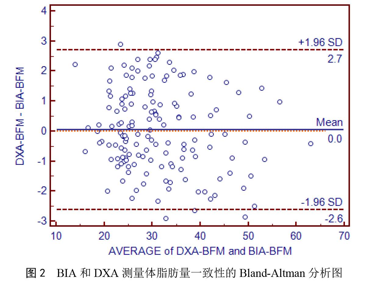 2.2 兩種方法測量結果的一致性分析 對 BIA 和 DXA 人體成分分析儀測量人體脂肪率的一致性進(jìn)行Bland-Altman 分析,如圖 1 所示,從圖中可以看出,148 個(gè)點(diǎn)中有 7 個(gè)位于一致性界限范圍以外,比例為 4.73%,小于 5%。在一致性界限范圍內,BIA 與 DXA 測量結果差值的絕對值最大為 3.30,兩種方法測量結果的平均值為 39.15,這種相差的幅度在臨床上可以接受,因此可以認為兩種方法測量的結果具有較好的一致性,兩種方法在臨床上測量脂肪率時(shí)可以互相代替使用。