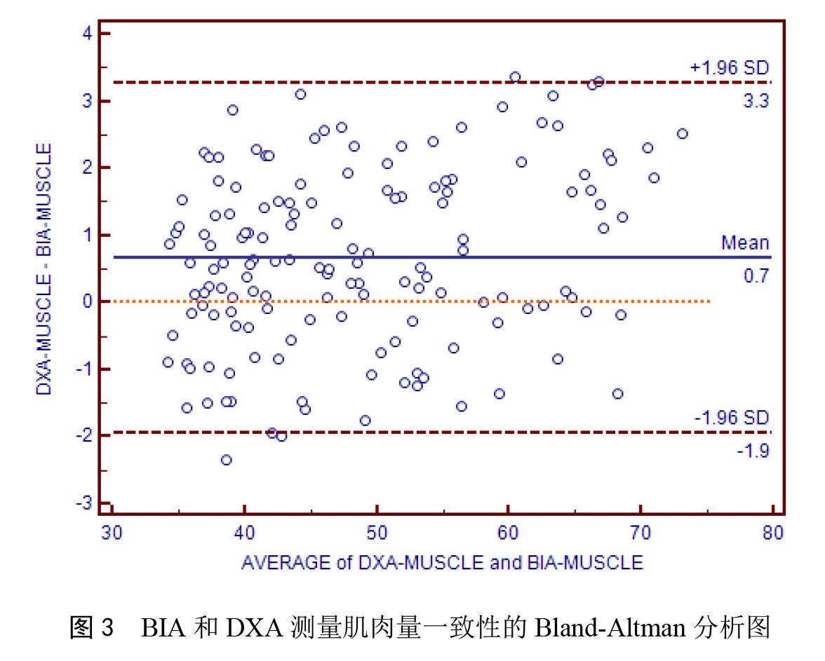 對 BIA 和 DXA 測量人體肌肉量的一致性進(jìn)行 Bland-Altman 分析,如圖 3 所示,從圖中可以看出,148 個(gè)點(diǎn)中有 5 個(gè)位于一致性界限范圍以外,比例為 3.38%,小于 5%。在一致性界限范圍內,BIA 與 DXA 測量結果差值的絕對值最大為 3.26,兩種方法測量結果的平均值為 66.33kg,這種相差的幅度在臨床上可以接受,因此可以認為兩種方法人體成分分析儀測量的結果具有較好的一致性,兩種方法在臨床上測量脂肪率時(shí)可以互相代替使用。