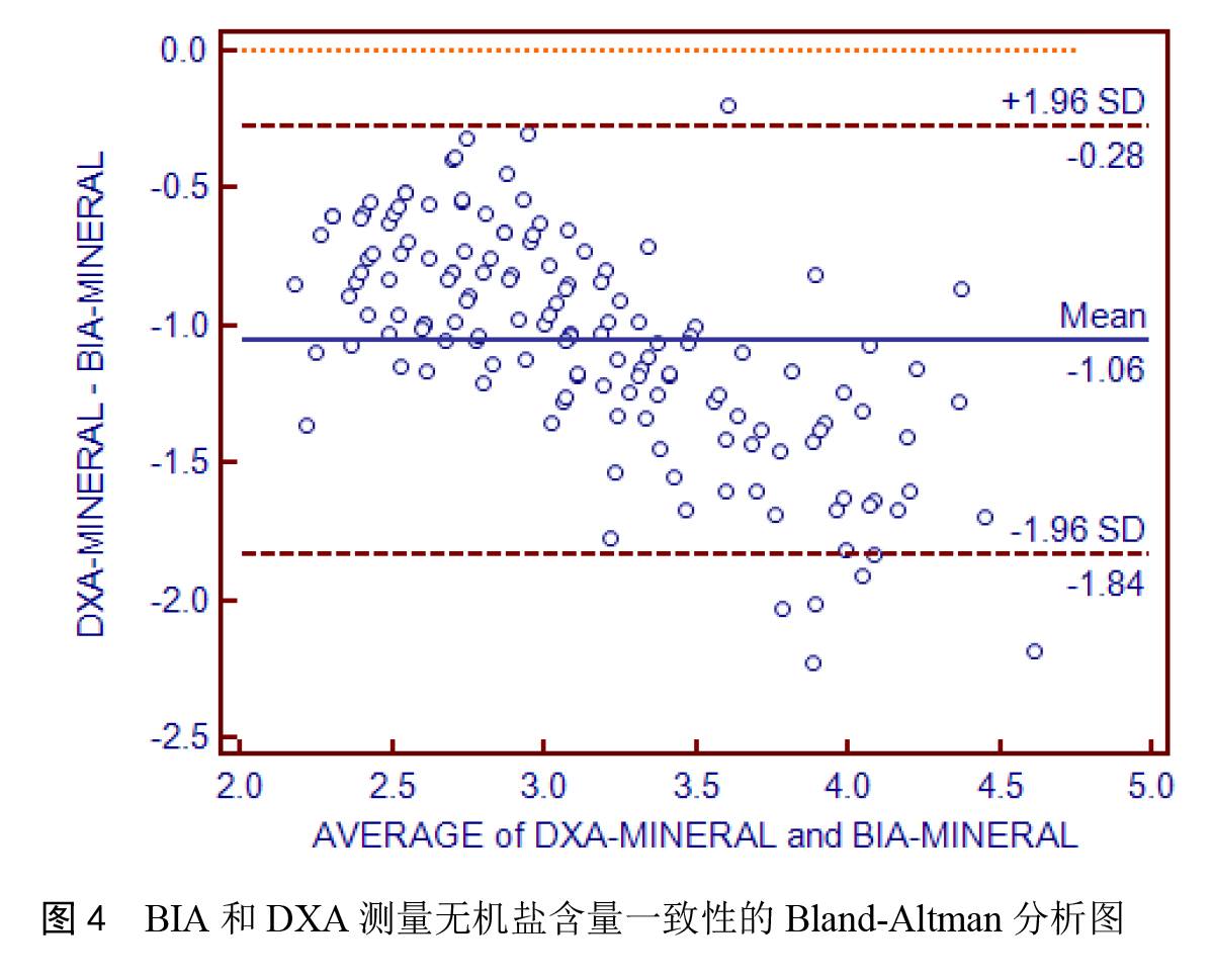 對 BIA 和 DXA 測量人體無(wú)機鹽含量的一致性進(jìn)行 Bland-Altman 分析,如圖 4 所示,從圖中可以看出,148 個(gè)點(diǎn)中有 7 個(gè)位于一致性界限范圍以外,比例為 4.73%,小于 5%。在一致性界限范圍內,BIA 與 DXA 測量結果差值的絕對值最大為 1.81,兩種方法測量結果的平均值為 3.99,這種相差的幅度在臨床上不可以接受,因此認為兩種方法測量無(wú)機鹽含量一致性較差。從圖上可以看出,DXA 與 BIA 人體成分分析儀測量的差值都為負數,因此,與 DXA 相比,BIA 的測量結果高估了無(wú)機鹽的含量。另外還可以看出,隨著(zhù) BIA 和 DXA 測量平均值的增大,DXA 與 BIA 差值的絕對值也逐漸增大。