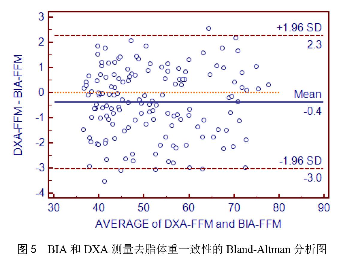 對 BIA 和 DXA 測量人體去脂體重的一致性進(jìn)行 Bland-Altman 分析,如圖 5 所示,從圖中可以看出,148 個(gè)點(diǎn)中有 5 個(gè)位于一致性界限范圍以外,比例為 3.38%,小于 5%。在一致性界限范圍內,BIA 與 DXA 測量結果差值的絕對值最大為 2.99,兩種方法測量結果的平均值為 60.11,這種相差的幅度在臨床上可以接受,因此可以認為兩種方法測量的結果具有較好的一致性,兩種人體成分分析儀方法在臨床上測量脂肪率時(shí)可以互相代替使用。